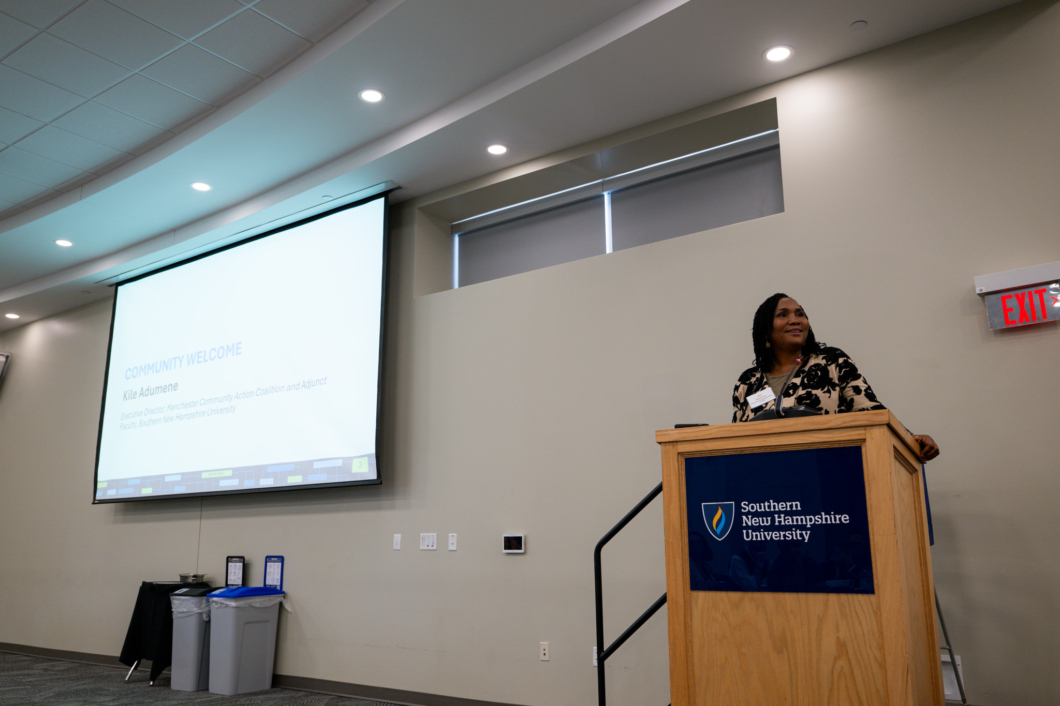 Kile Adumene, executive director, Manchester Community Action Coalition (MCAC), and adjunct faculty, Southern New Hampshire University, provided a community welcome.